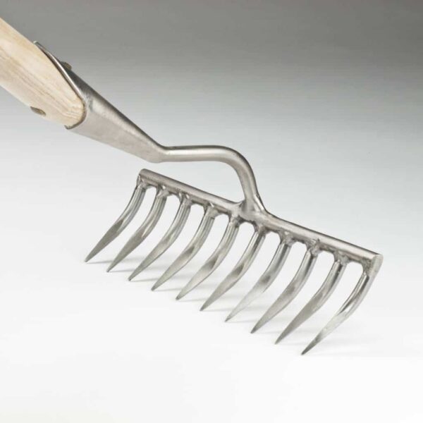 Die zehn feinen Zinken ermöglichen eine gleichmäßige Bodenbearbeitung, das Entfernen von kleinen Steinen und Gartenabfällen sowie die Vorbereitung von Beeten für die Aussaat. Der lange Stiel erleichtert das Arbeiten im Stehen und reduziert die Belastung für Rücken und Schultern.