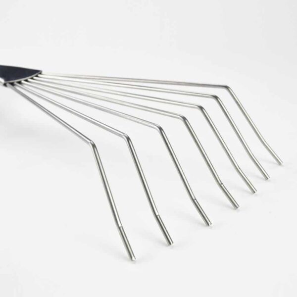Die feinen, leicht gebogenen Zinken ermöglichen das mühelose Zusammenharken von Laub und Gartenabfällen, ohne die Bodenstruktur zu beschädigen. Durch das kompakte Design ist die Harke ideal für präzise Arbeiten in kleineren Gartenbereichen.